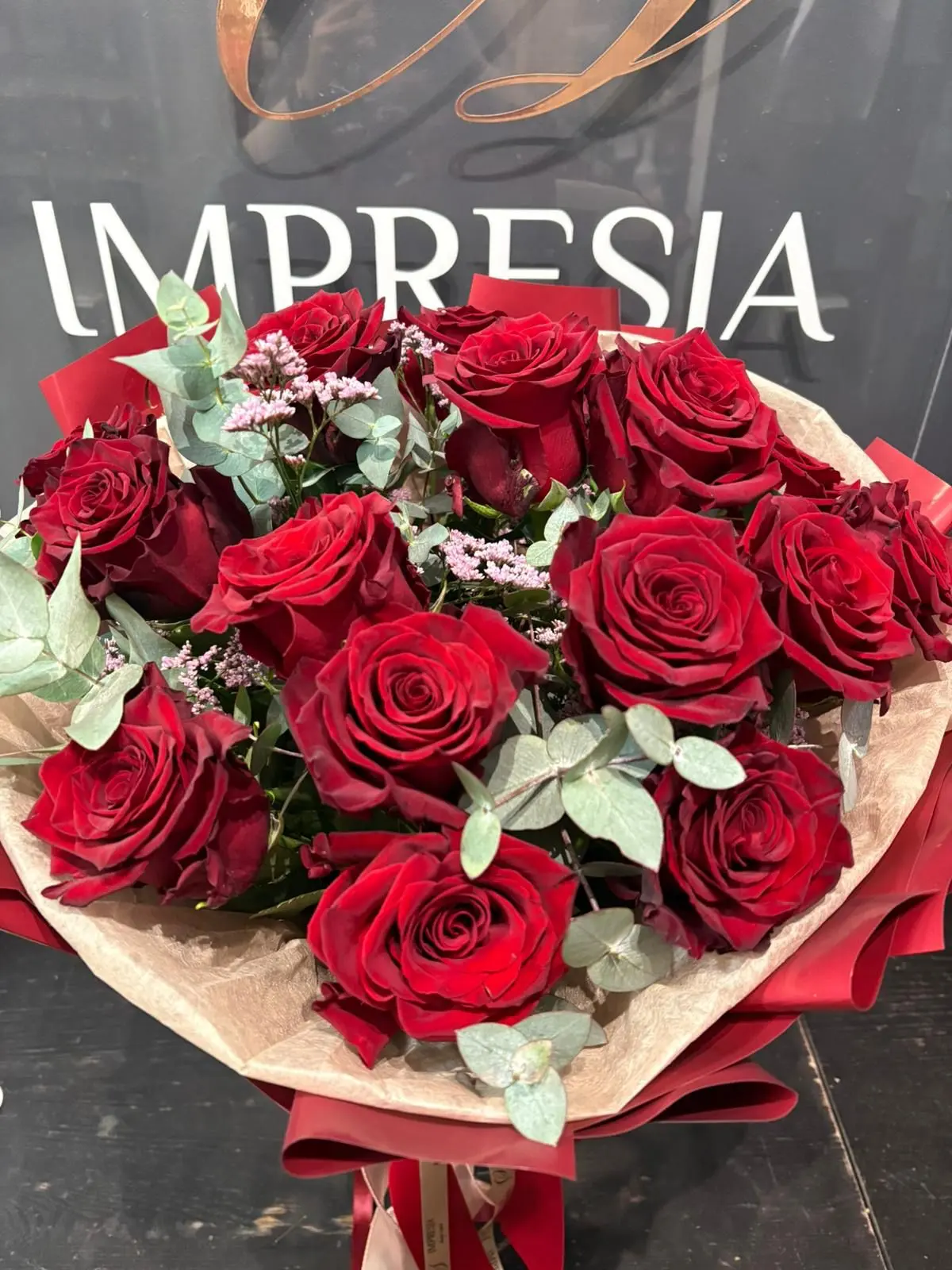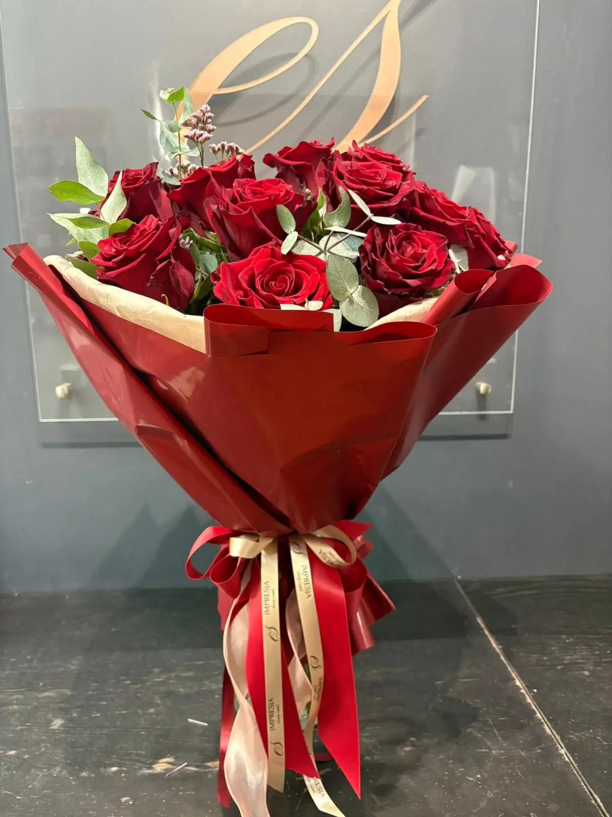 Bukiet czerwone róże z eukaliptusem