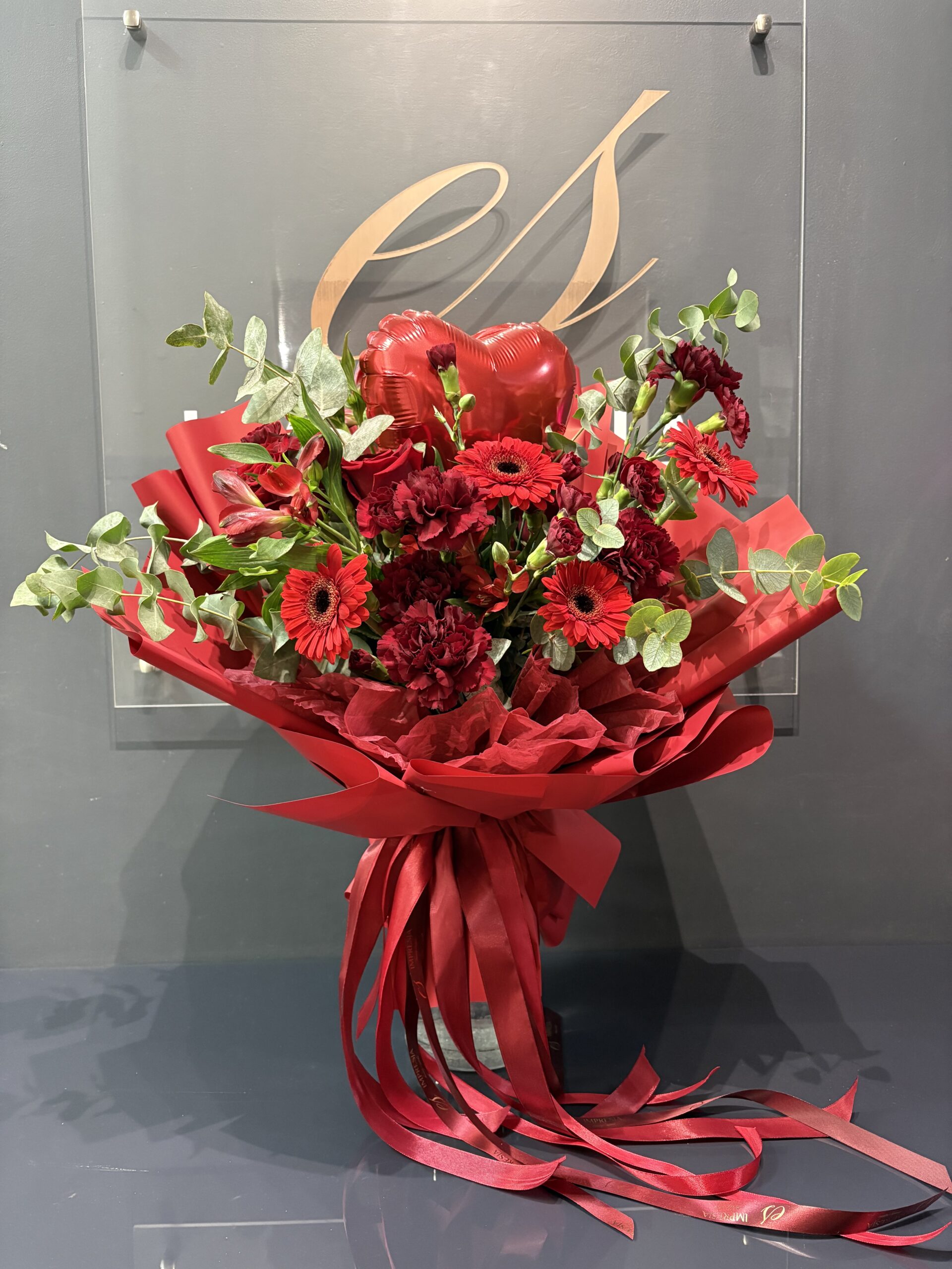 Bukiet z czerwonych kwiatów z balonem